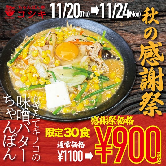 福岡の老舗「ちゃんぽん亭コシキ」より秋の特別企画。4種のキノコと特製味噌が織りなす“旨味の極み”――話題の「もぎたてキノコの味噌バターちゃんぽん」が、5日間限定で大特価販売。