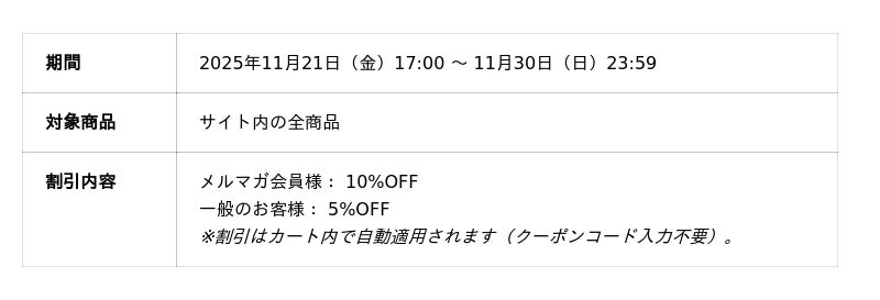 今回は、すべてのお客様が対象の「一般割引(5%OFF)」に加え、メルマガ会員様には「限定割引(10%OFF)」をご用意しました。ログインしてメルマガ受信設定をオンにするだけで、全てのアイテムが表示価格から10%OFFになります。