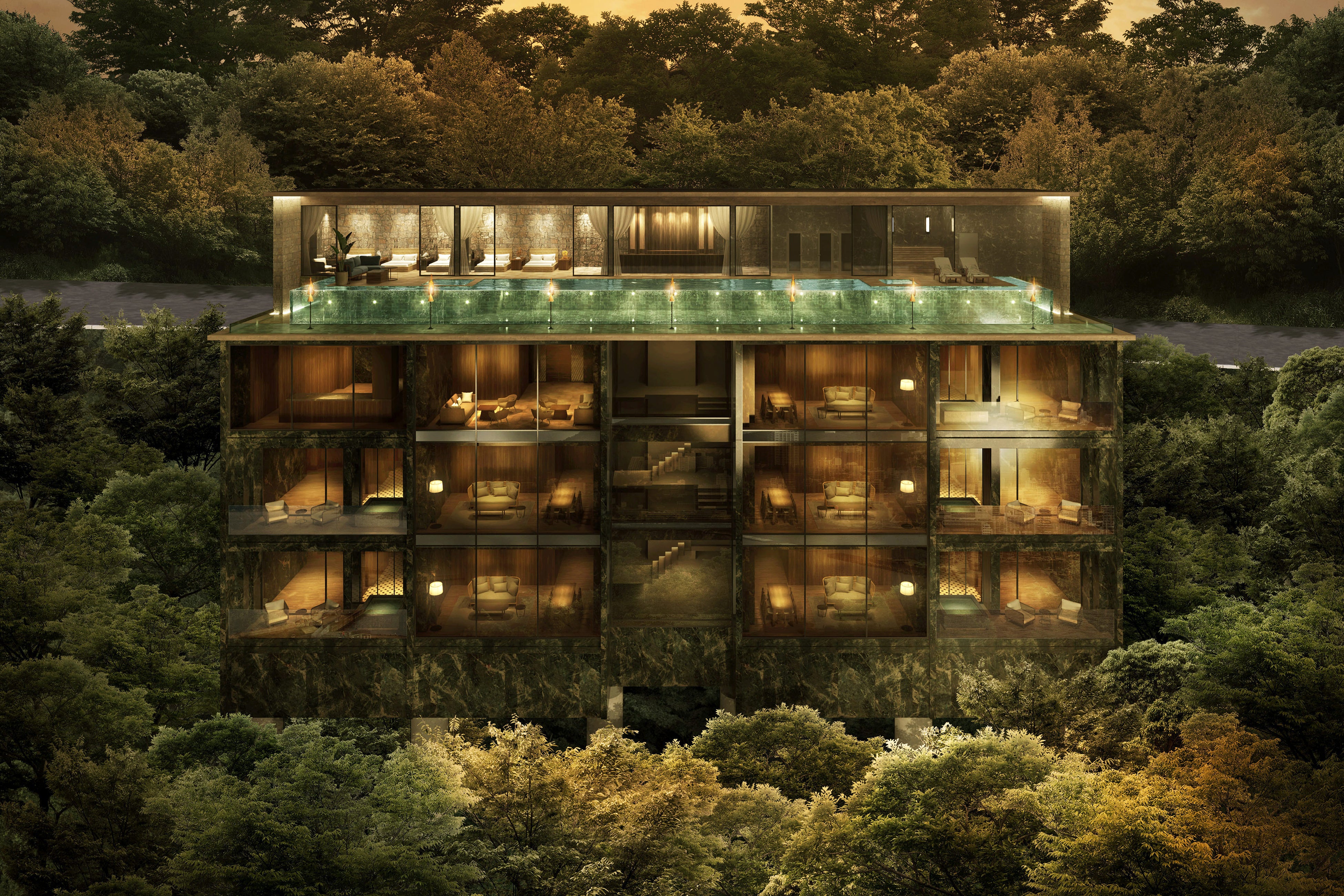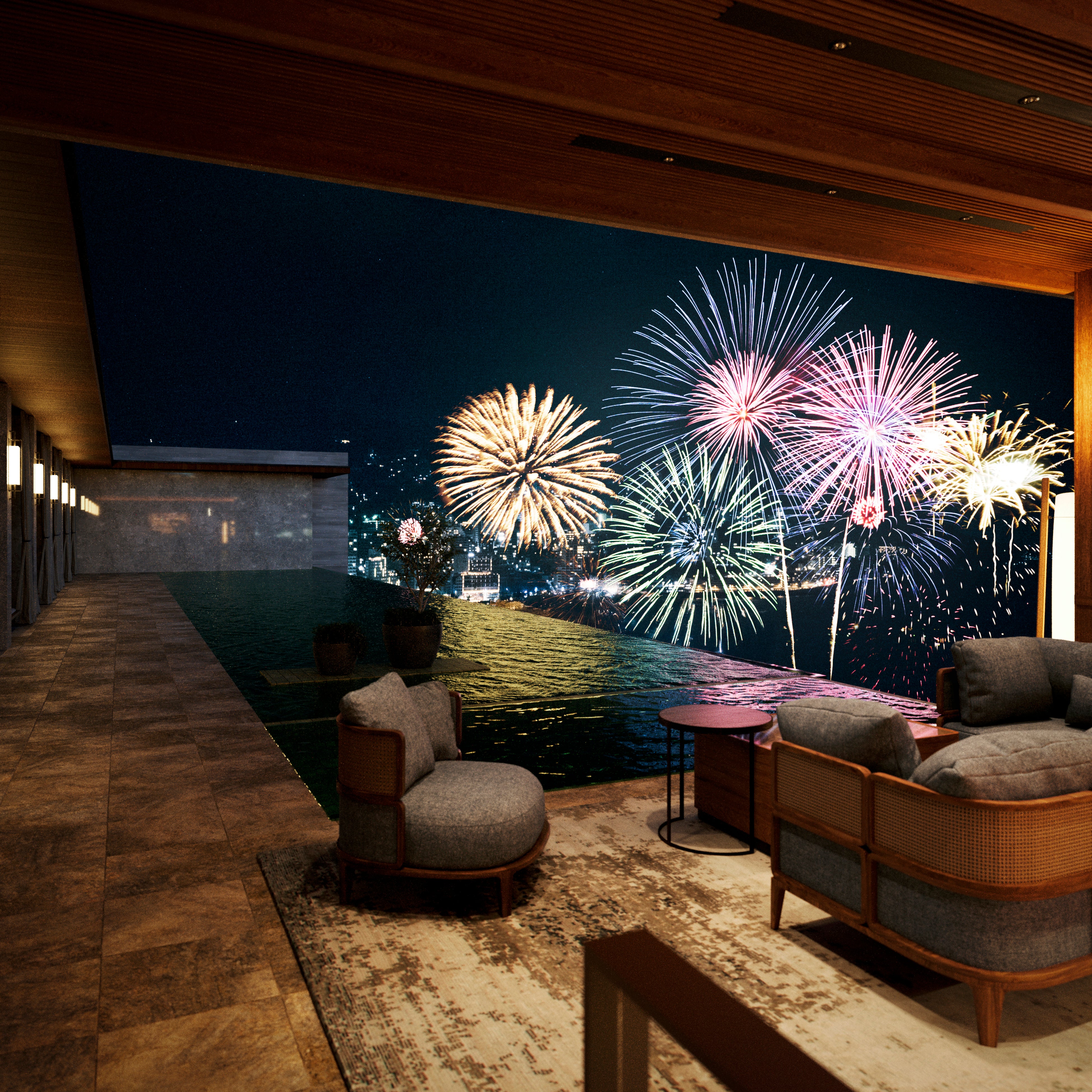 ルーフトップのインフィニティプールからは、花火が目の前に上がる熱海ならではの眺望を、自宅の延長として楽しむことができます。