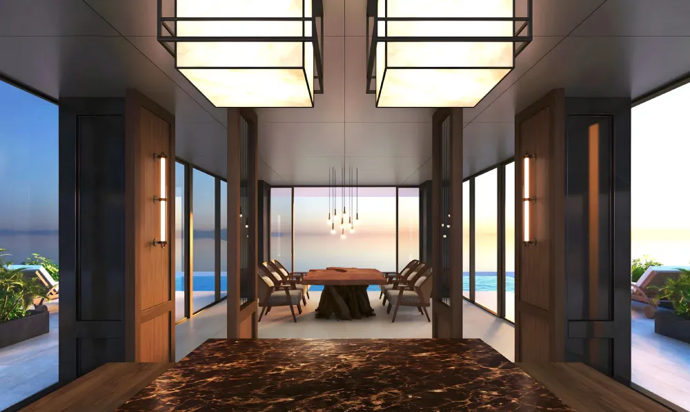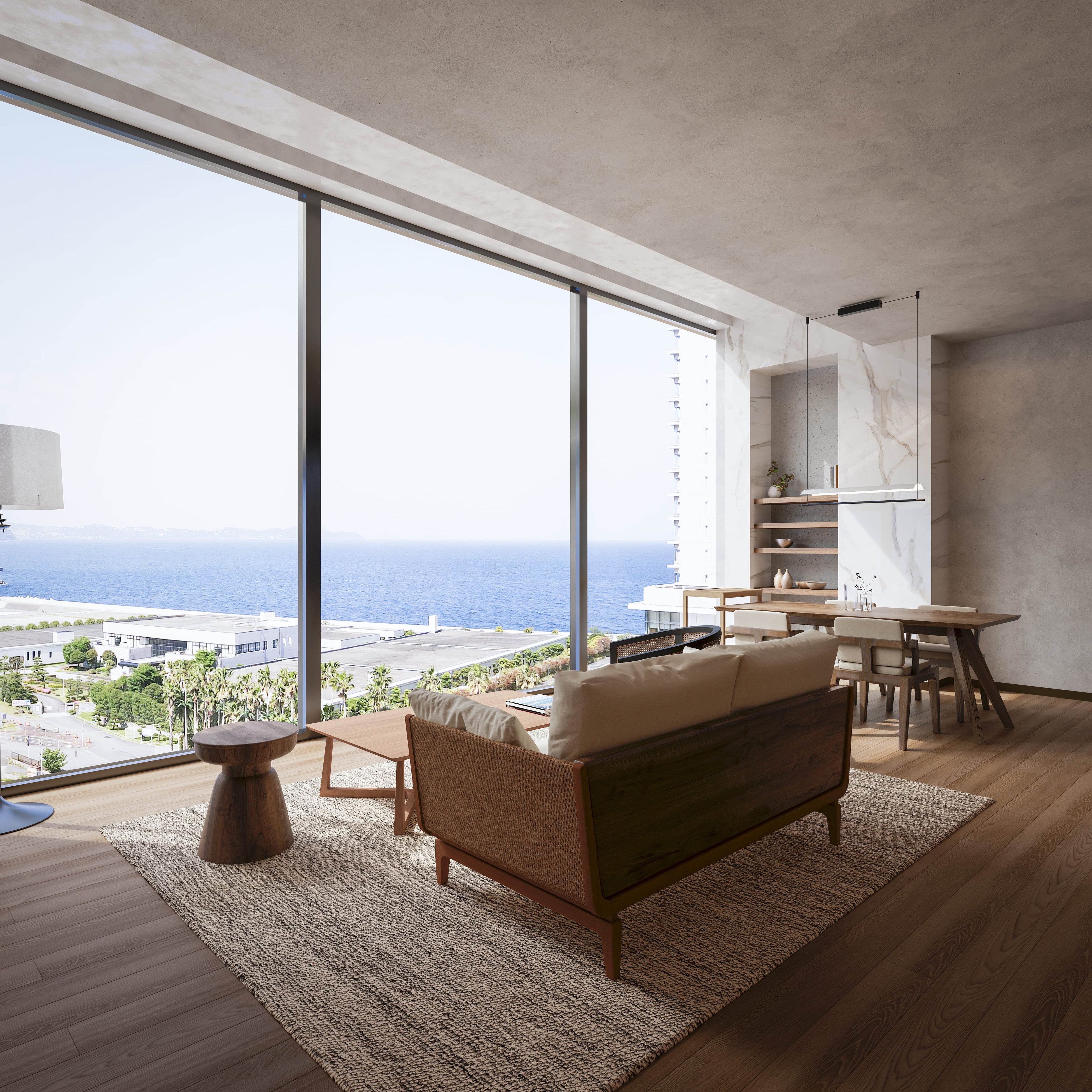 海を見渡せる開放的なリビングルームは、波音に包まれながら大切な時間を紡ぐ場所として設計されています。