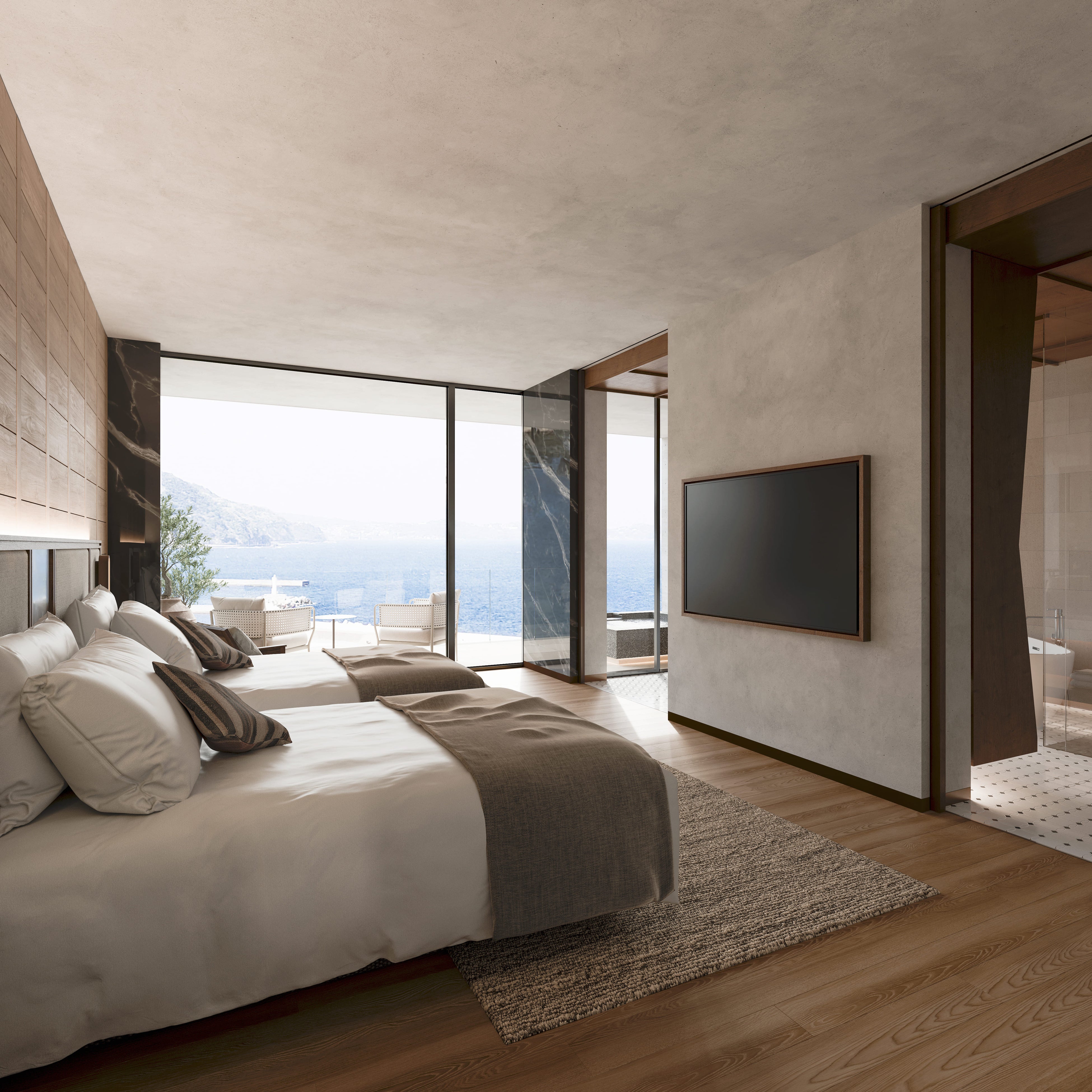 2つの独立した寝室と充実した水回りを完備。朝の目覚めとともに海と自然の息吹を感じられ、贅沢な時間をお過ごしいただけます。