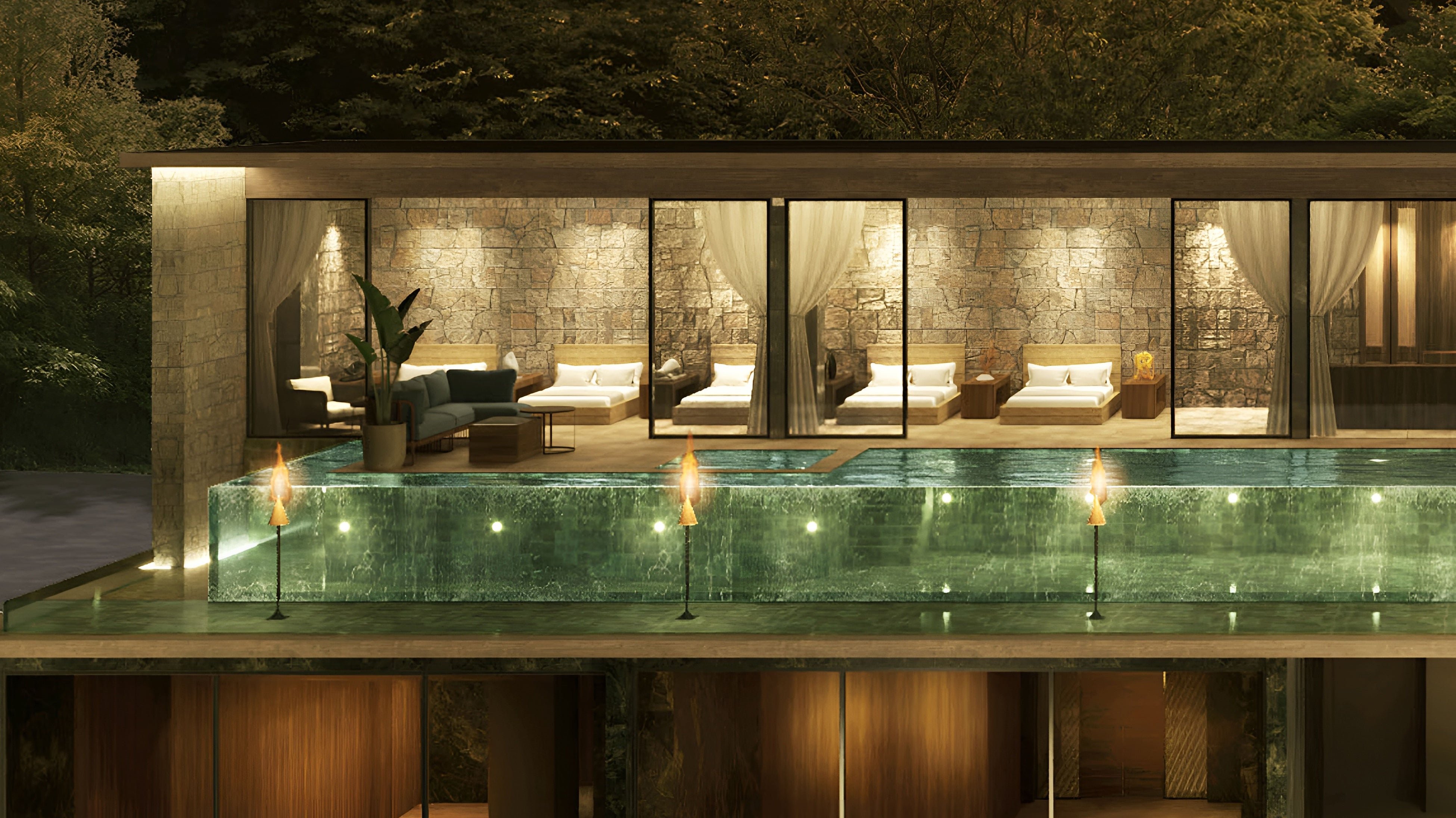 プールサイドには海外リゾートを彷彿とさせるカバナ、ラウンジにはBARカウンターを備えるなど、滞在者だけが楽しめる贅沢な空間デザインを実現しています。