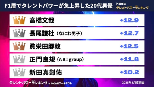 『タレントパワーランキング』では、タレントパワーランキングに登録されている、2025年11月20日時点で年齢が20代の男優について、F1層(20~34歳女性)が回答した結果のスコアを調査。