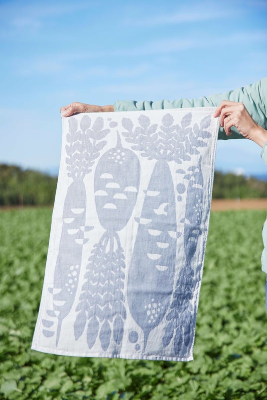 今回のコラボ企画では、三浦野菜をテーマに「地元良品JOURNEY三浦半島篇」で作り手や届ける仕事に携わる人々を取材し、美味しさの秘密を紐解く連載記事を展開。そのストーリーをベースに「LOCAL TEXITLE PROJECT」で「三浦野菜もよう」を生み出し、野菜と親和性の高い日用品として、キッチンタオルに仕立てました。