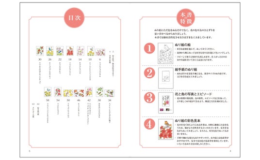 また、実物大のぬり絵見本付きで、見本を見ながら塗っても、好きな色で塗っても楽しめます。さらに花の開花期や鳥の特徴などを写真とともに解説。会話が広がります。
