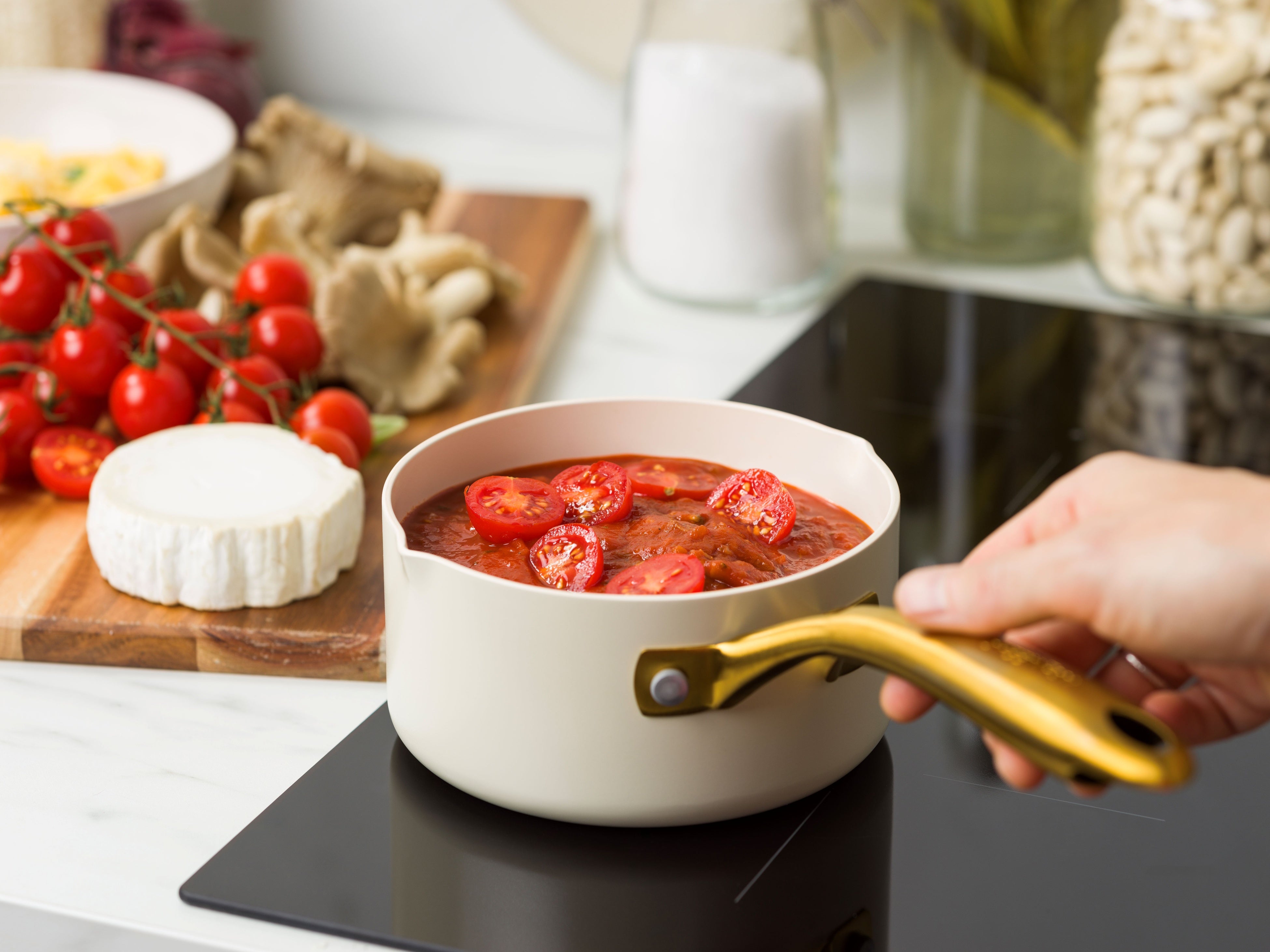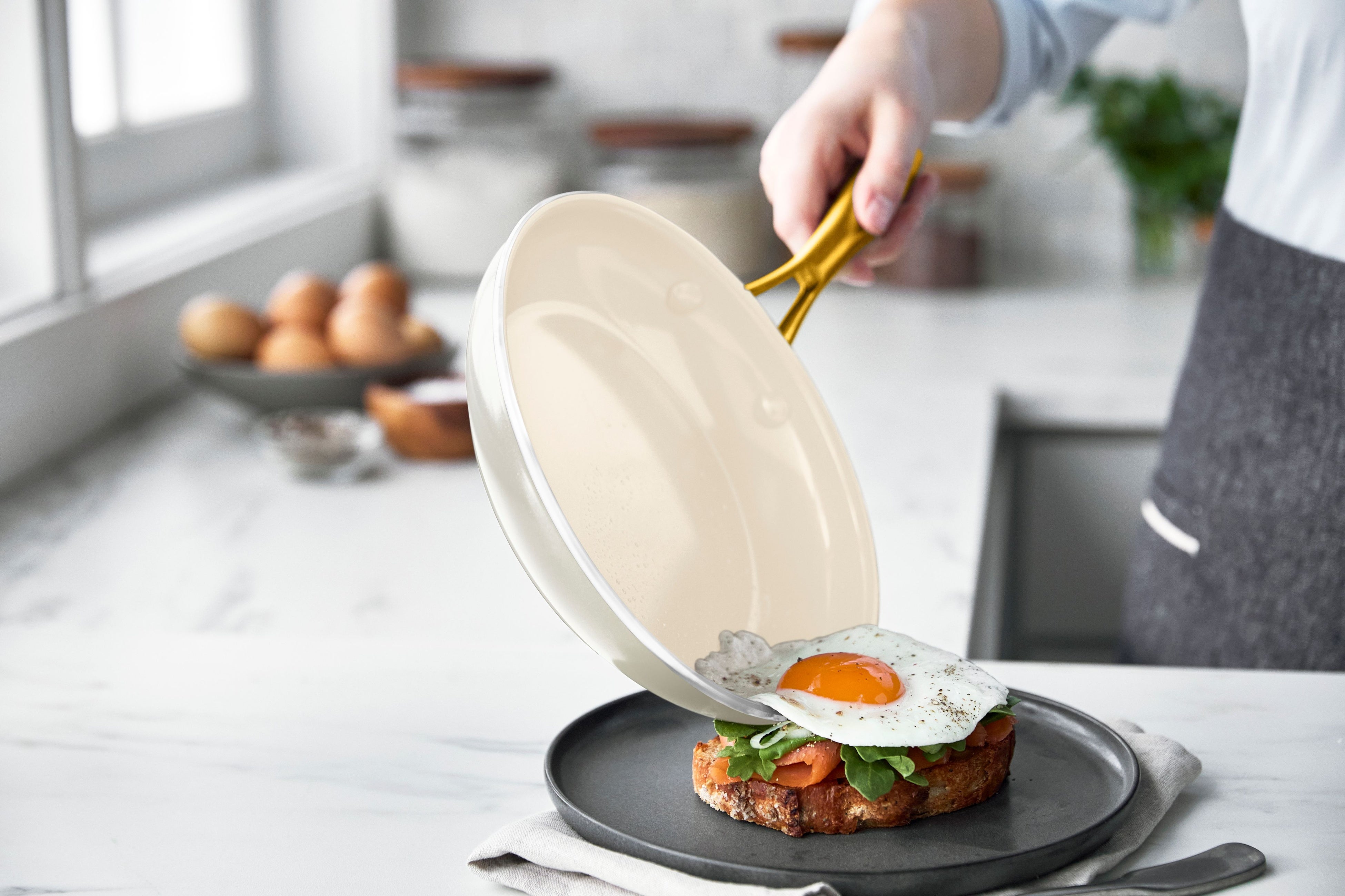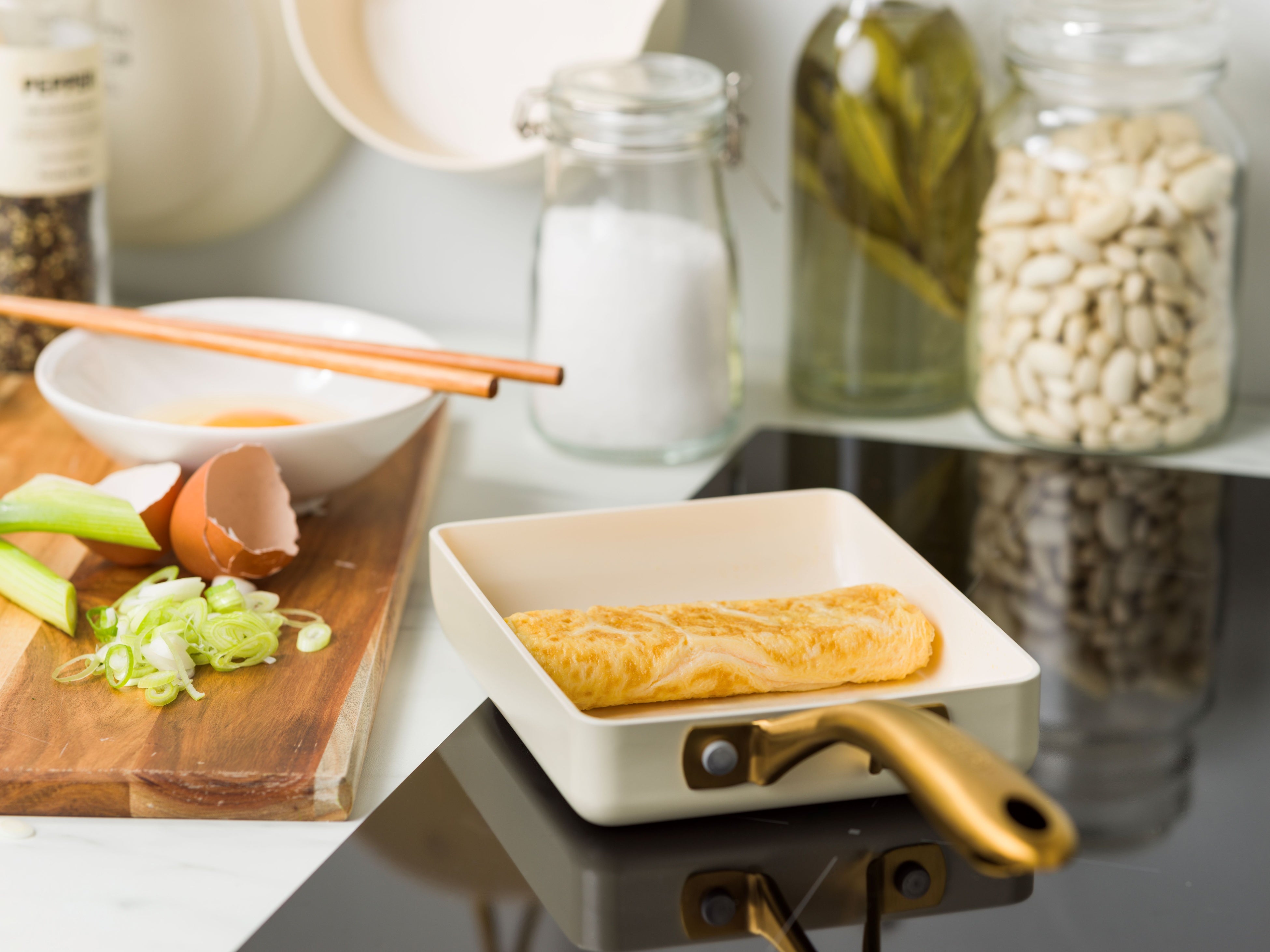 柔らかなクリームホワイトのボディに、輝くゴールドのハンドルを組み合わせました。調理後、そのまま食卓に出すだけで、テーブルを華やかに演出します。ガラス蓋のつまみも細くエレガントなデザインに仕上げています(フライパンのガラス蓋は別売りです)。