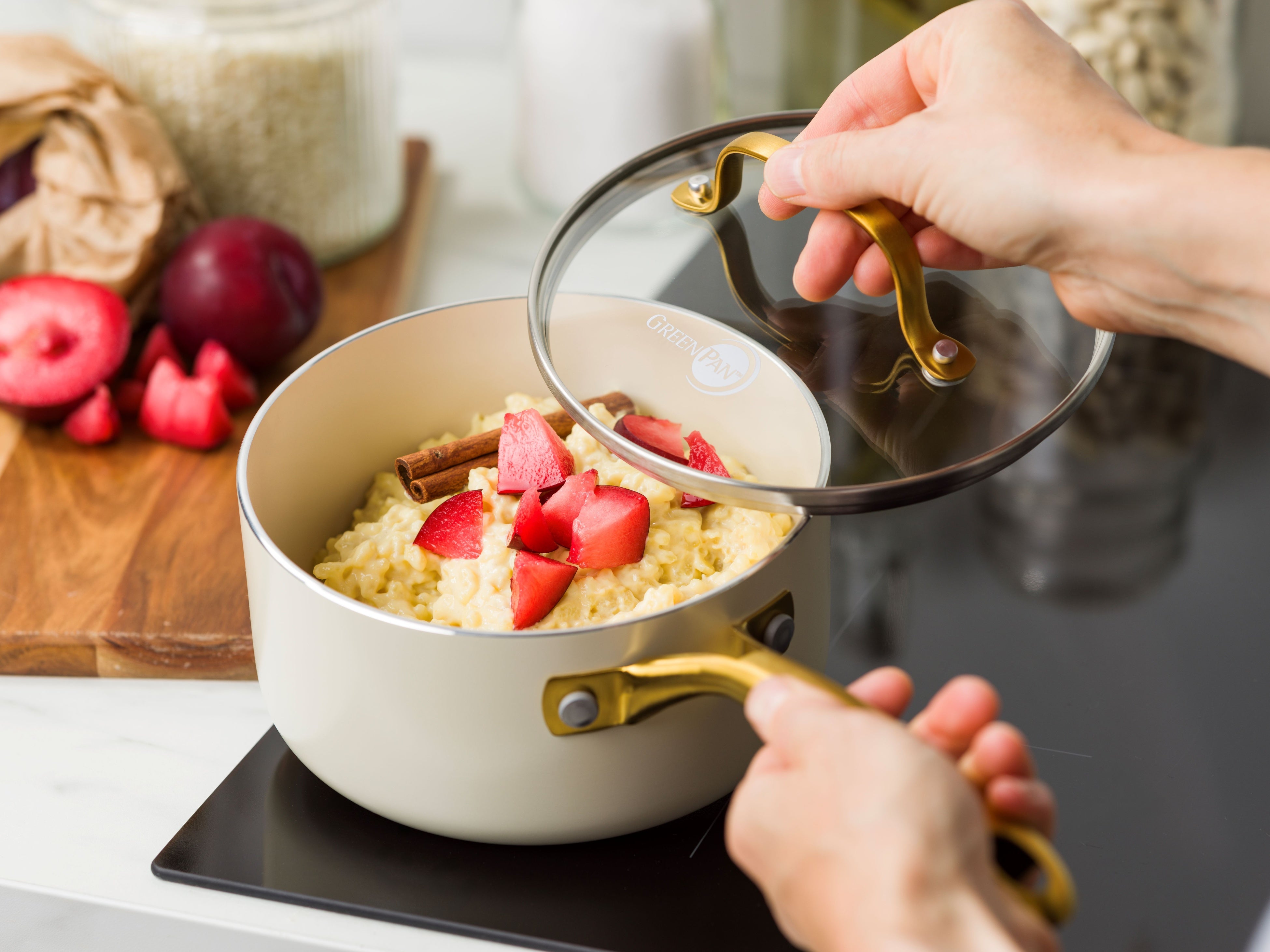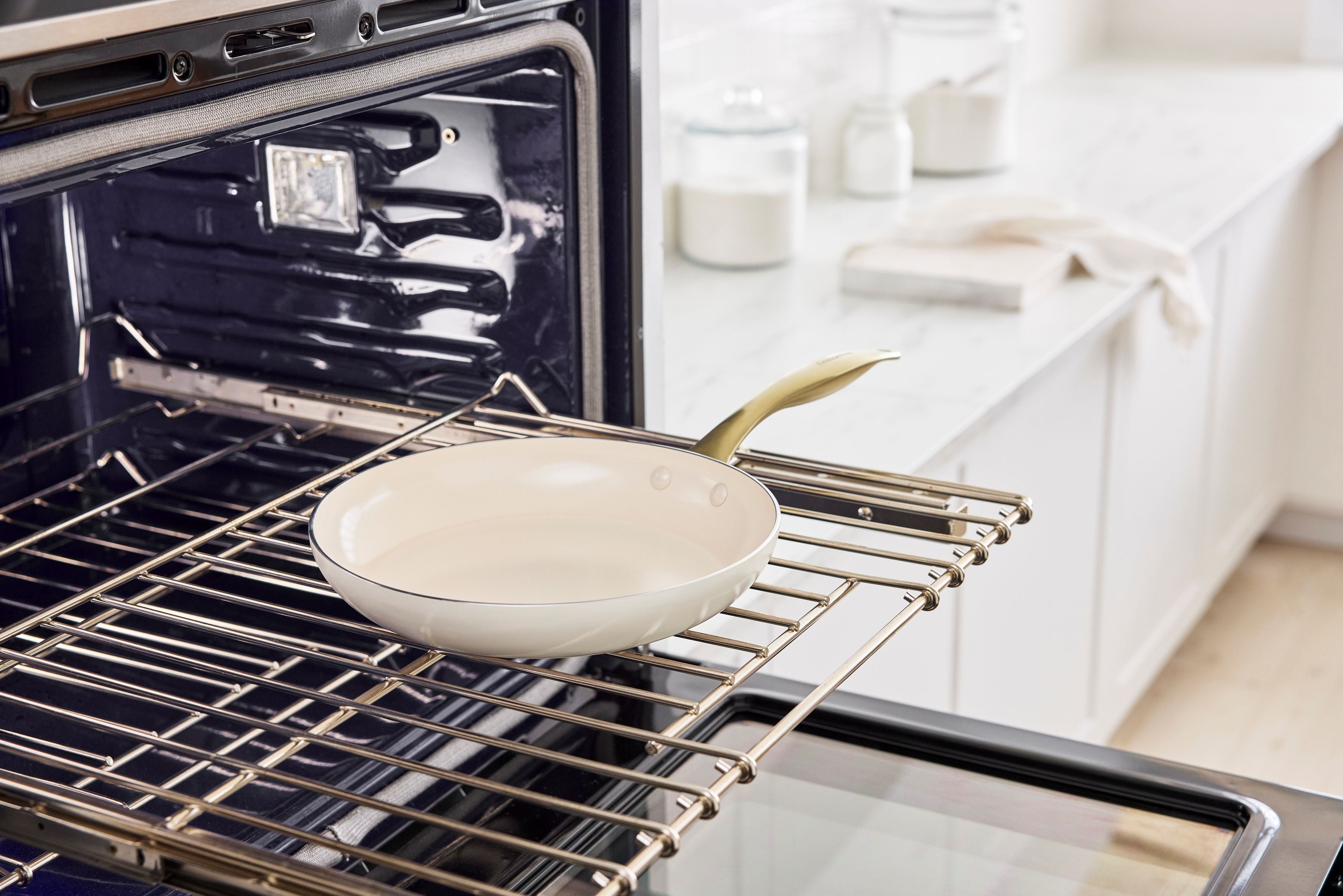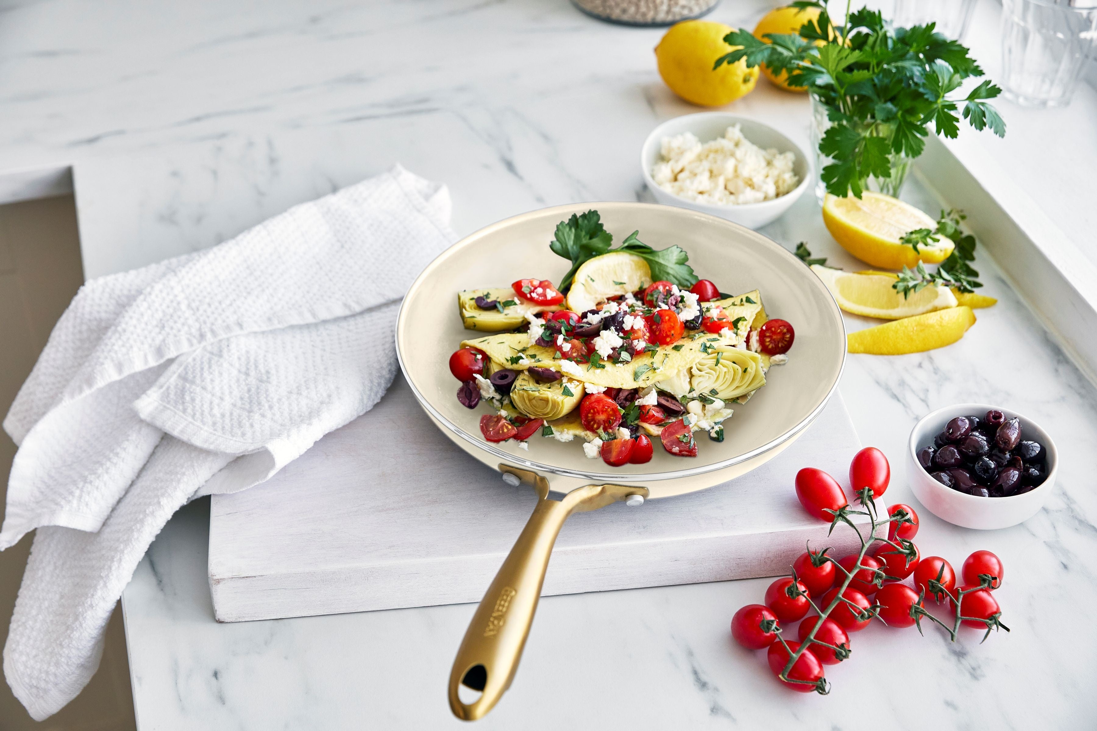 柔らかなクリームホワイトのボディに、輝くゴールドのハンドルを組み合わせました。調理後、そのまま食卓に出すだけで、テーブルを華やかに演出します。ガラス蓋のつまみも細くエレガントなデザインに仕上げています(フライパンのガラス蓋は別売りです)。