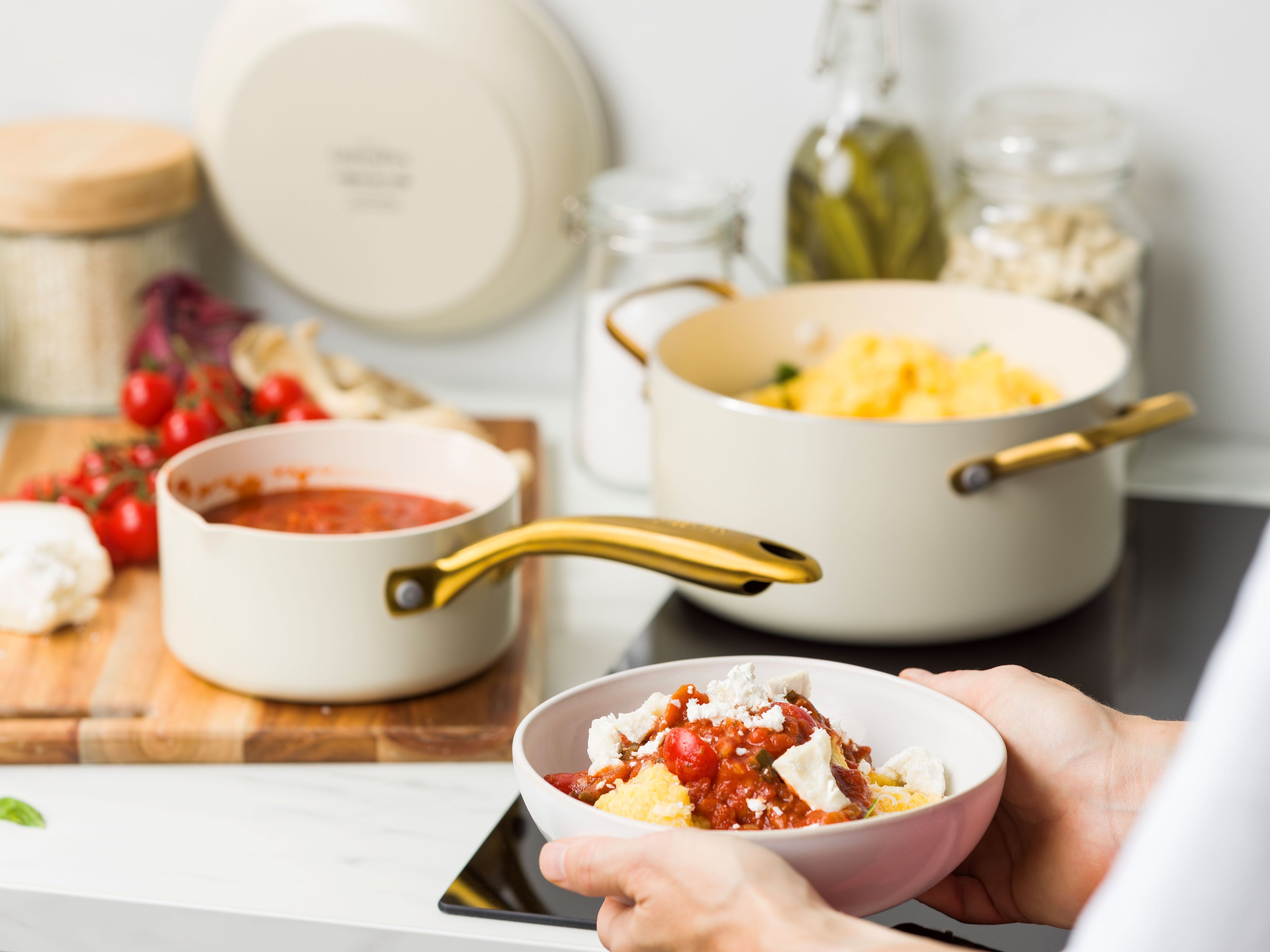「Studio」コレクションは、輝くゴールドハンドルが特徴の、食卓にそのままサーブしても華やかなシリーズです。今回、既存のブラックに加えて、温かみのある「クリームホワイト」が仲間入りします。