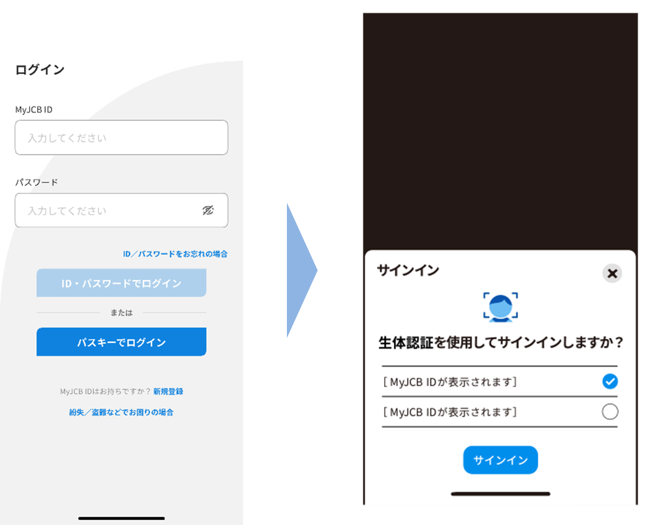 ログインしたいMyJCB IDを選択のうえ、生体認証などでログインできます。