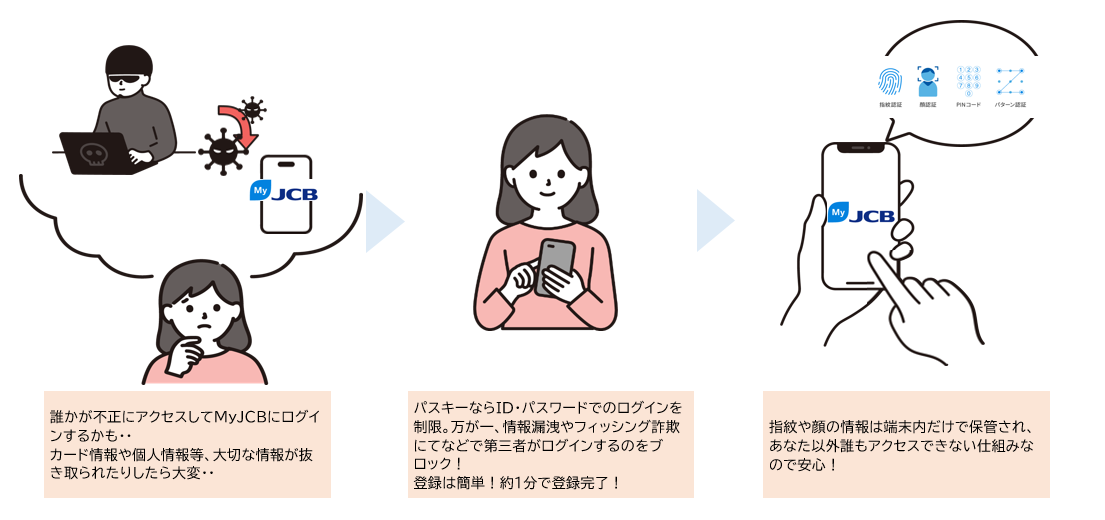 MyJCBのログイン方法として「パスキー」を導入します。「パスキー」を登録することで、パスワードを使ったログインが制限されるため、フィッシングなどによる不正ログインを防ぐことが可能です。また、ID・パスワードを入力せずに、お使いの端末で設定しているロック解除方法(生体認証やパターン認証など)を使ってログインするので操作も簡単です。