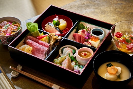 1. 京都の冬の美味を集めたホテル特製「松花堂弁当」を楽しむランチ付きトークショー前には、寒鰤や聖護院蕪、汲み上げ湯葉など、冬の京都らしい食材を使ったホテル特製「松花堂弁当」をご用意します。蟹や鰻をあしらった京風蒸し寿司や白味噌仕立てのお椀、柑橘のムースなど、多彩な品々をお楽しみいただけます。