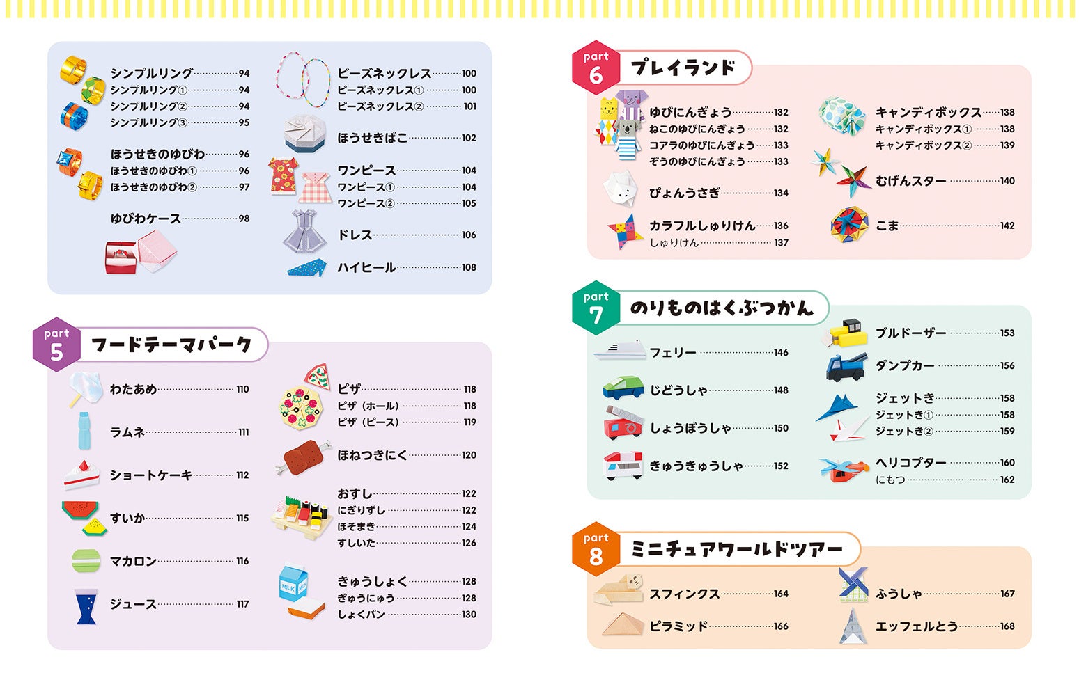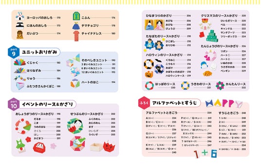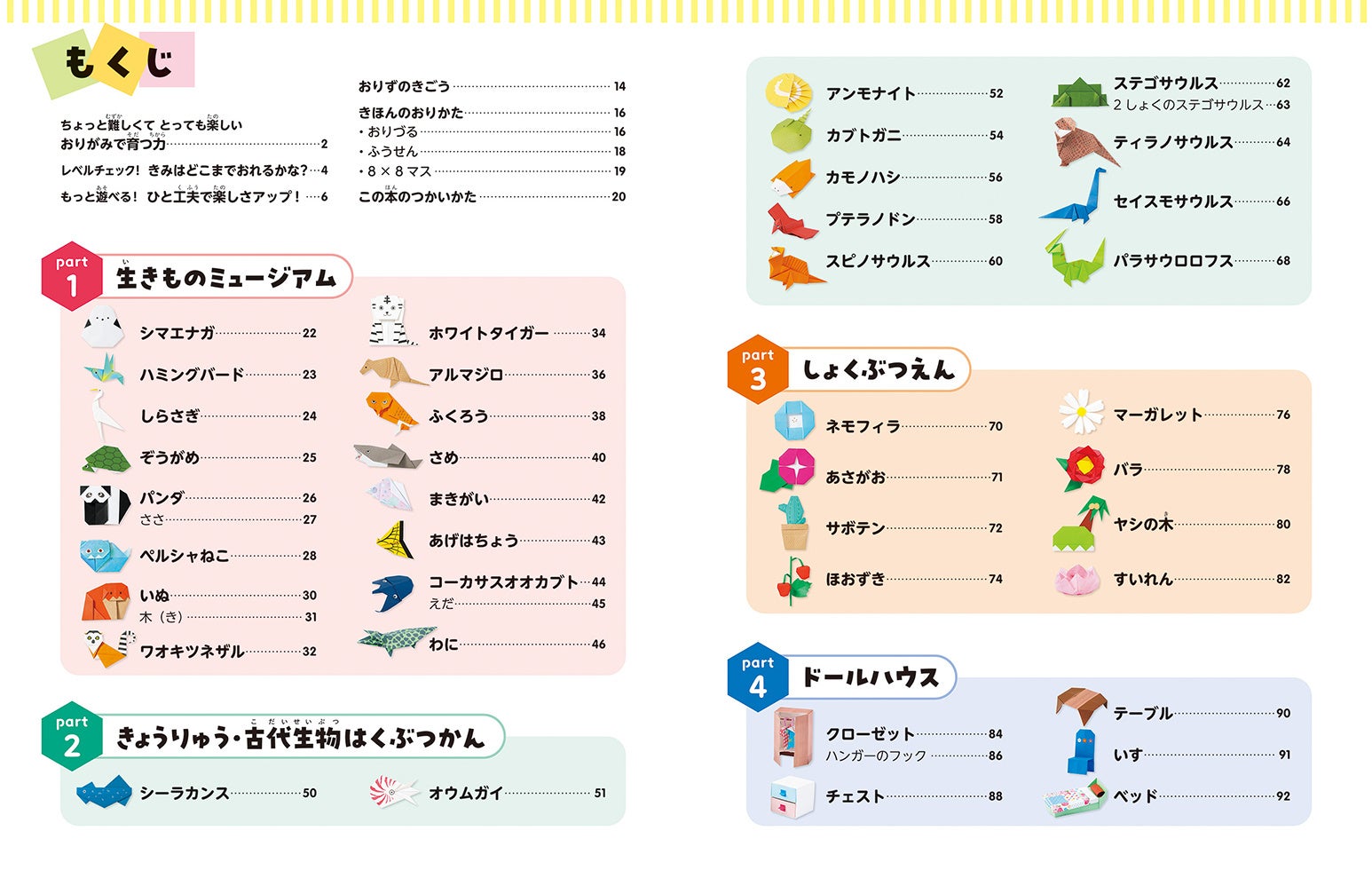 かわいい動物、立体的な恐竜、食べ物、乗り物、花々やドールハウスから、ユニットおりがみ、イベントのリースかざり、26文字のアルファベットまで。