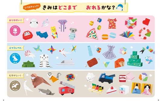 「折れたらすごい!」の名の通り、仕上がり作品はむずかしそうに見えますが、「むずかしすぎて完成させられない」ことはないよう、できるだけわかりやすく、ていねいに折り方を紹介しています。