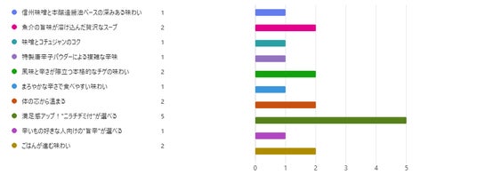最も多くの票を集めたのは「満足感アップ!"ニラチヂミ付"が選べる」というポイントでした。続いて、『魚介の旨味が溶け込んだ贅沢なスープ』、『風味と辛さが際立つ本格的なチゲの味わい』、『体の芯から温まる』『ごはんが進む味わい』の四項目が同率2位でした。