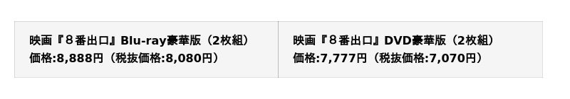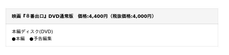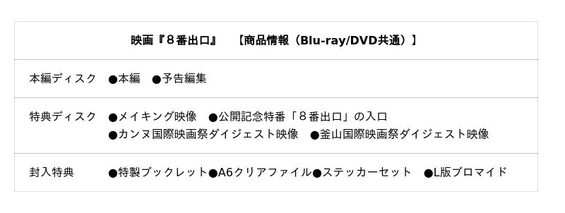 二宮和也氏も脚本段階から携わり、川村監督を始めとするクリエイター陣と原作ゲームの持つ独特な魅力や“異変”の妙をどのように映画に落とし込んだのか、そのクリエイティブな挑戦の様子も収録。 限られた空間の中で“出口のない迷路”をいかに表現するか、こだわり抜いて作り上げた『8番出口』の全貌をぜひご覧ください。さらに、映画の魅力を徹底解剖した「特番『8番出口』の入口」で、作品の秘密や見どころを深掘り。国内外の注目を集めた「カンヌ国際映画祭ダイジェスト」や「釜山国際映画祭ダイジェスト」収録。封入特典には、作品の世界観を深める特製ブックレットやA6クリアファイル、ステッカーセット、L判ブロマイドなどコレクター心をくすぐるアイテムが目白押し。映像特典と封入アイテムを合わせた、ファン垂涎の「8大特典」はBlu-ray&DVD豪華版で登場!