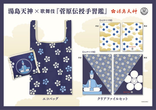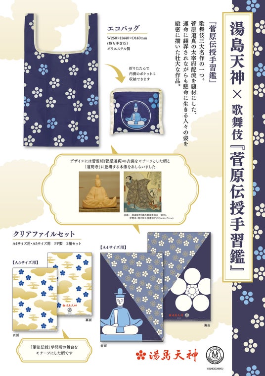松竹株式会社(東京都中央区築地、代表取締役 高橋 敏弘)事業推進部は、湯島天満宮(東京都文京区湯島)と歌舞伎『菅原伝授手習鑑』がコラボしたデザインのクリアファイルセットとエコバッグを企画いたしました。