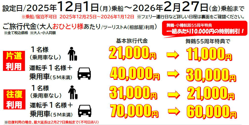 2025年11月14日にデビューした「新造船・けやき」もご利用いただける冬限定のお得な船旅「ウインタープラン」を発売いたしました。おひとり様から乗用車付き、片道のみ、往復利用など自由度の高い商品となっております。往路到着後には、舞鶴市内のシティホテル「東舞鶴ホテルアルスタイン」1泊付き。さらに、舞鶴・小樽航路55周年特典1組あたり10,000円の特別割引!