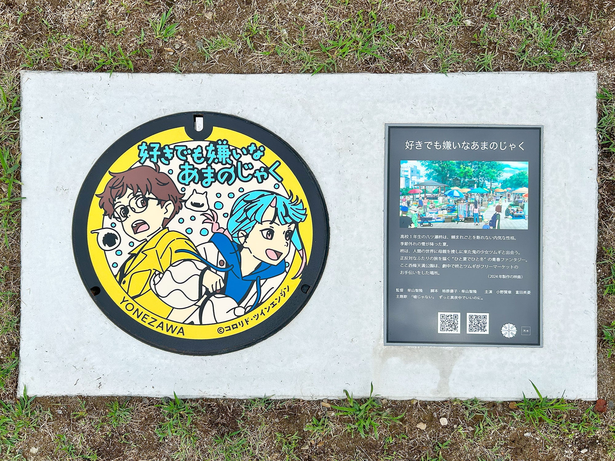 山形県米沢市を舞台とした長編アニメーション映画「好きでも嫌いなあまのじゃく」の公開・配信を記念し、映画の主人公「柊とツムギ」をデザインしたご当地マンホールを製作し、映画のロケ地である「西條天満公園」に設置しています。このマンホールをデザインした「マンホールカード」の配布が12月19日(金)より道の駅米沢総合観光案内所ではじまります。