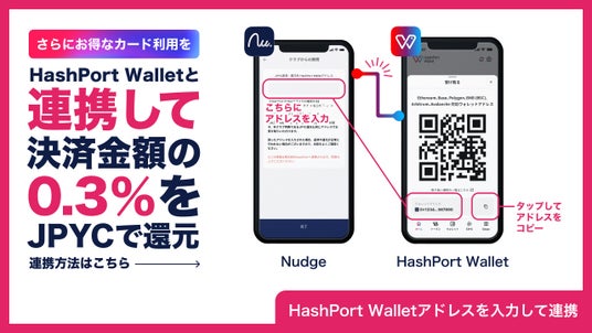 リリース時は、Nudgeがカードの発行およびステーブルコイン(JPYC)での支払い受付を担当します。HashPortは、HashPort WalletとHashPortカードのデータ連携を通じて、JPYCによる還元・特典付与を行うほか、将来的には利用額相当のJPYCをガスレスで自動引き落とす仕組みにも対応予定です。