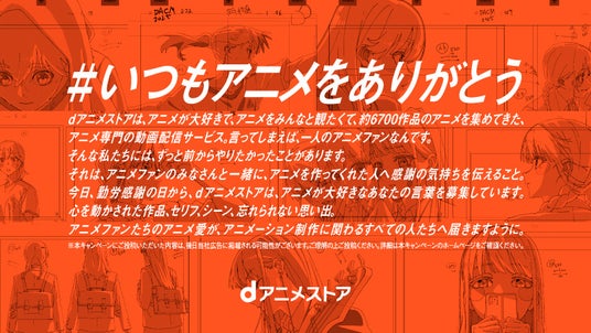 最近では、アニメ1話の制作に100名以上もの人たちが関わっていることも珍しくありません。スタッフロールに名前があるすべての職種の人たちに、 11月23日の勤労感謝の日をきっかけにあらためて感謝の声を届けることができるなら、とても素敵なことだと思いました。dアニメストアでは、アニメ制作に関係するすべての方々に、アニメファンの皆さんが普段から思っている、あるいは改めて伝えたい、そんな感謝の声を募集いたします。お寄せいただいた皆さんの声は、dアニメストアがいろいろなかたちで広告化してお届けする予定です!