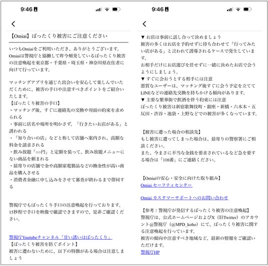 【警視庁と連携した注意喚起画面(「Omiai」の画面例)】