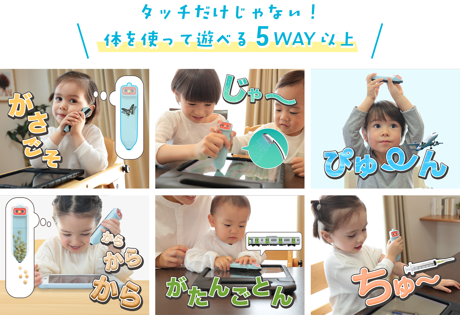 タッチだけでなく、振る・置くなど、自由な発送で「感触ペン」を見立てて遊べます。