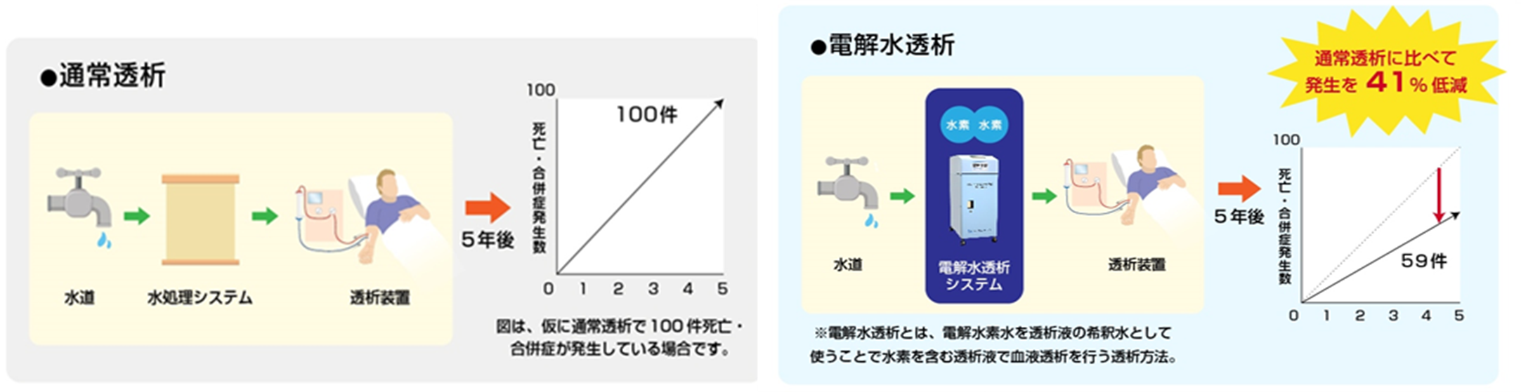 腎不全患者の治療に用いられる血液透析は、水を大量に使用する治療法で1回あたり約120リットルの水を使用します。当社は、この“水”に、1997年に九州大学との共同研究で抗酸化作用を確認した “電解水素水”を応用することを世界で初めて着想し、「電解水透析(R)」の取り組みを開始しました。そして2005年からの東北大学をはじめとした研究機関との産学共同研究により、「電解水透析(R)」において水素分子(H2)が作用因子として抗酸化作用を発揮し、生体適合性を高めることを突き止めました。その後、臨床データの取得と共に透析システム(国内外特許取得)の開発にも取り組み、2011年に「電解水透析(R)システム」を発売、2020年には標準化タイプの「電解水透析用水作製装置」を発売しております。現在、日本では37施設に導入され、「電解水透析(R)」を受けられる病床数は累計1127床です。(2025年9月末現在)