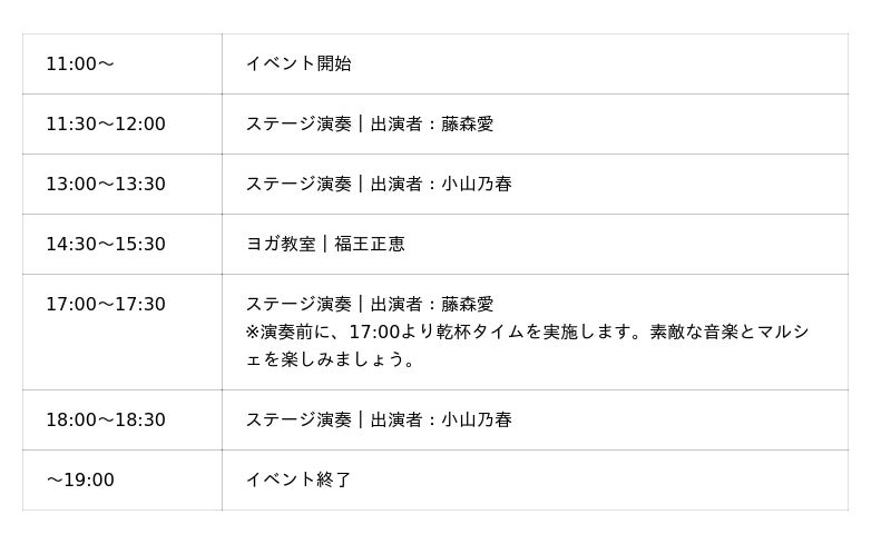 人工芝を敷いたキッズコーナーで、遊んだり休んだりしながらゆったり過ごせます。会場では、家族みんなで楽しめるアクティビティやワークショップも開催予定。好きな時間に立ち寄って、自分のペースで一日をお楽しみください。● ヨガ体験(14:30~15:30)