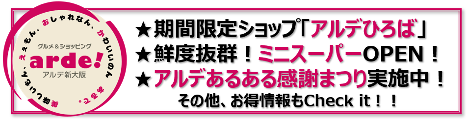 話題性の高いお店がかわるがわる出店するアルデひろばの新ネタを中心に、アルデ新大阪のイベント情報等についてお知らせいたします!