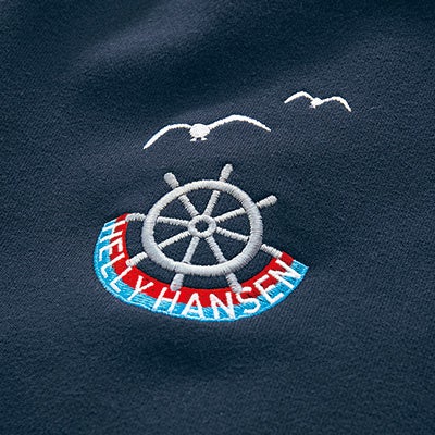 ▲海を象徴するカモメに未来を切り開く舵輪の刺しゅう。自然との共生を目指すブランドの意志を反映した、当社限定の特別なデザインです。