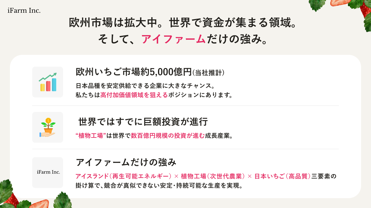 アイファーム株式会社は、アイスランドの再生可能エネルギーを利用する植物工場で、日本品種の美味しいいちごを生産し、欧州の消費者に提供しています。