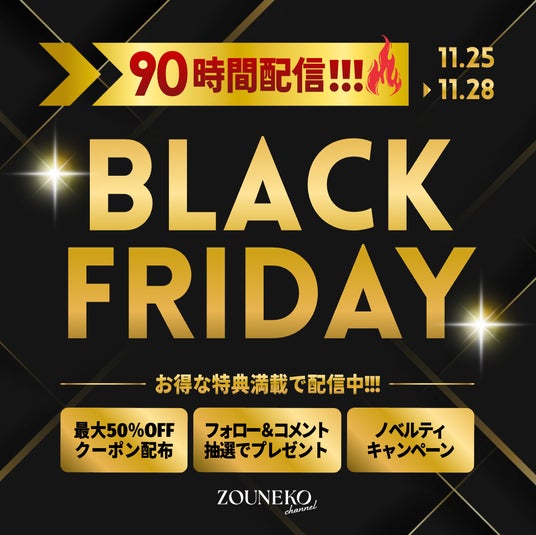 ブラックフライデー期間中は「ぞうねこちゃんねる」より、最大50%オフクーポンを配布。いつどのタイミングでクーポンを配布されるのかは当日のお楽しみ!見逃せない90時間!