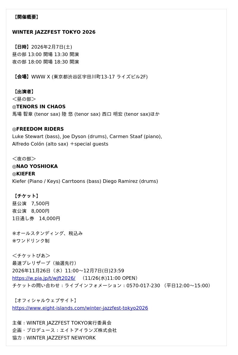 ジャズをより多彩なオーディエンスに届けながら、音楽の力で文化や社会を変えていきたいというWINTER JAZZFEST NEWYORKのスピリッツに賛同し、この度初の「WINTER JAZZFEST TOKYO 2026」を開催します。東京版は、渋谷で最先端の音楽文化を発信し続けるWWWXからスタートします。