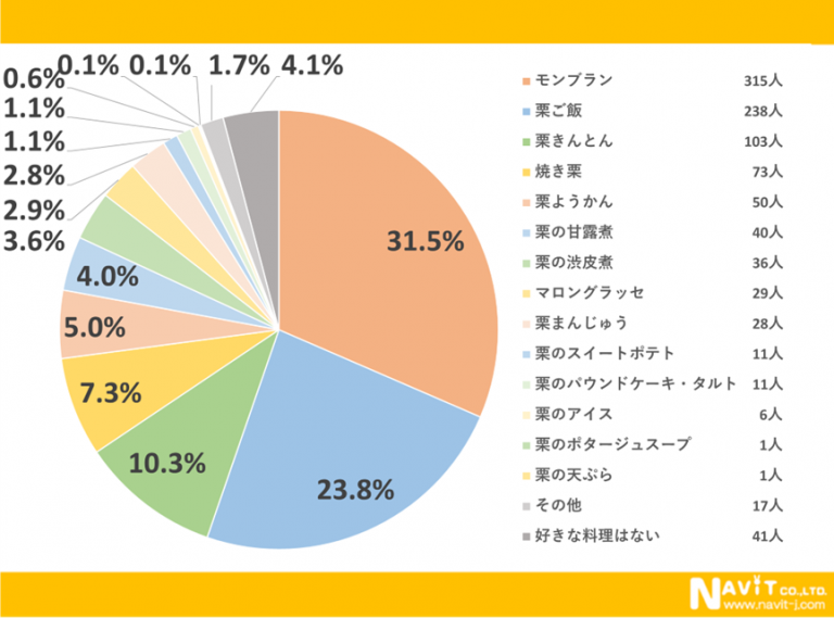 栗料理で1番好きなものをたずねたアンケートでは、「モンブラン」が1番多く31.5%でした。次に多かったのは「栗ご飯」で23.8%、3番目が「栗きんとん」で10.3%という結果になりました。全体として甘味が上位に入る中、栗ご飯が大健闘という感じの回答になりました。