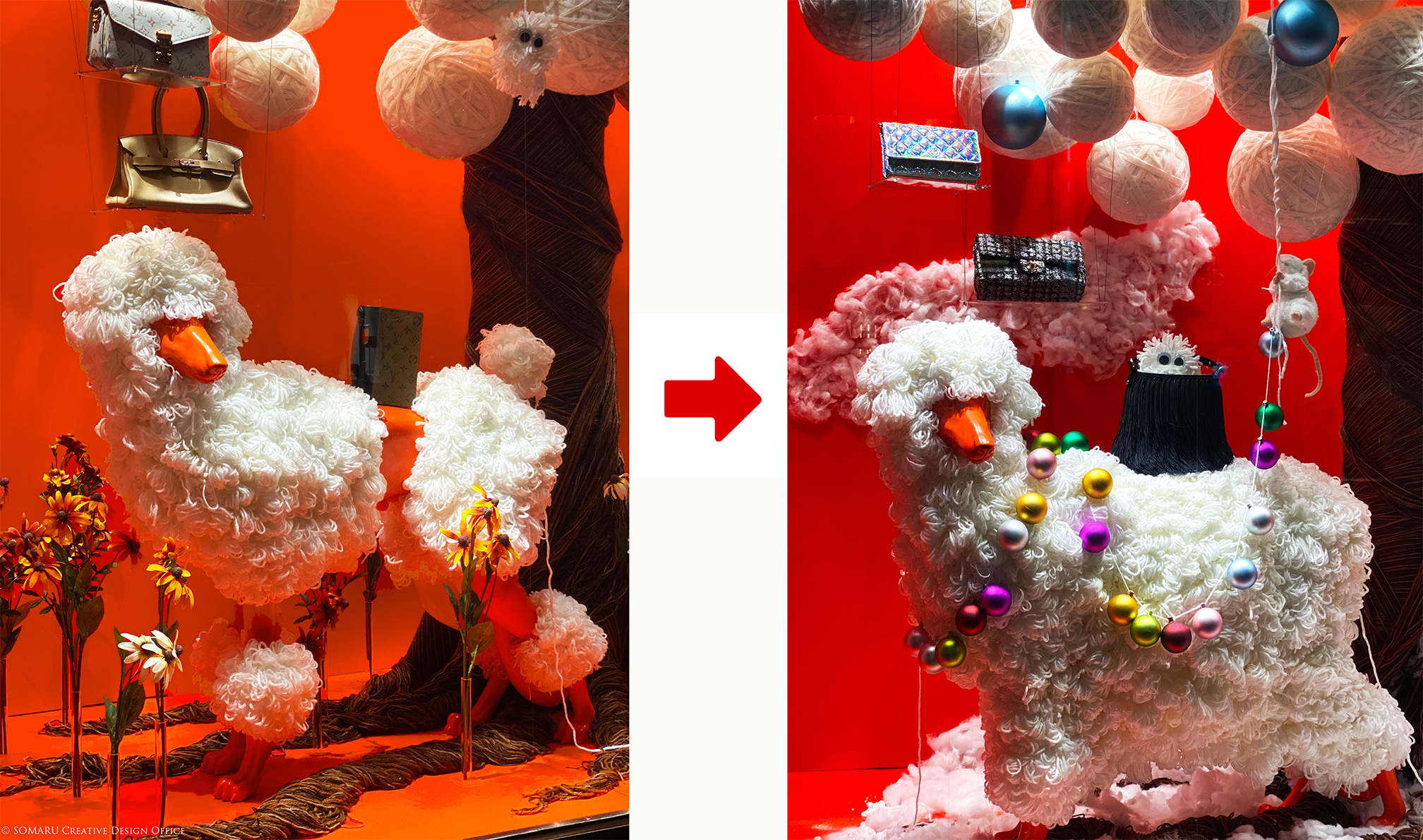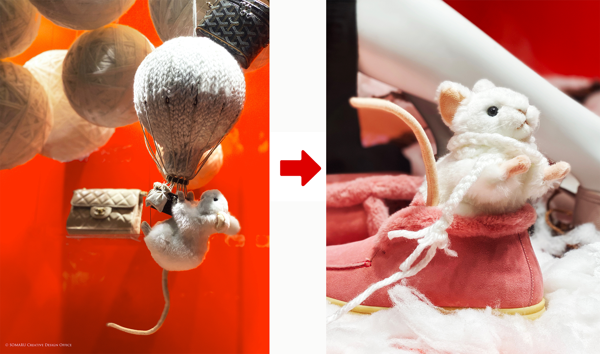 この街でお客様をお迎えするにあたり、ショーウィンドウは道行く方々とコメ兵をつなぐ大切なコミュニケーションの場と考えております。シーズンごとの装飾は、多くの方にフォトスポットとして楽しんでいただいており、嬉しい限りです。今回の「Leads to Christmas」は、商品だけでなく、季節や人の想いを『つなぐ』ことをテーマに、動物たちが愛らしく冬支度をする様子を表現した作品です。ウィンドウの細部に散りばめた仕掛けを楽しんでいただいた後は、ぜひ店内へも足をお運びください。冬を彩る素敵なリユースアイテムとの出会いをご用意してお待ちしております。