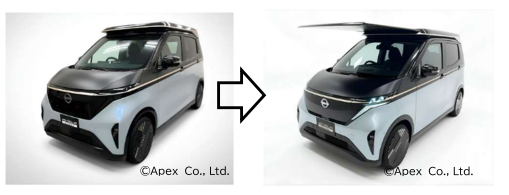 軽 EV「サクラ」に搭載されたスライド式ソーラーシステム のプロトタイプモデルにおいて、車体ルーフ部のソーラーパネ ルユニットの設計・製作をアペックスが担当