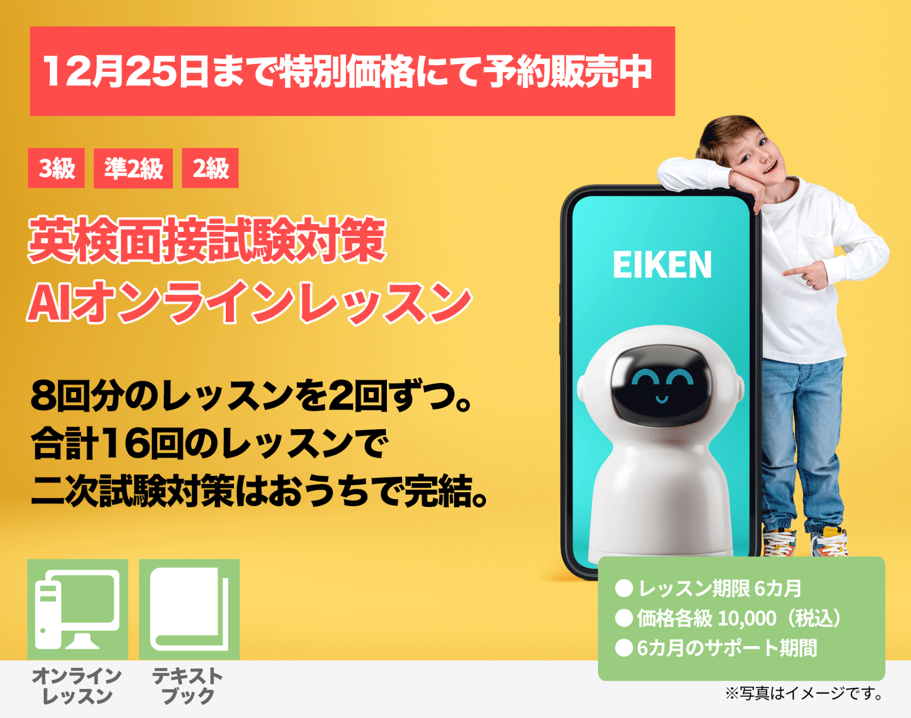 株式会社児童英語研究所(東京都新宿区)は、英検対策教材「英検オンラインレッスン」にAI面接機能「英検オンラインレッスン【面接】」を新たに追加する。本機能は英検3級・準2級・2級に対応し、AIが面接官として音読・内容理解・イラスト描写・意見表明までを自動評価するものである。本機能の取り組み開始は12月26日(金)以降となる。