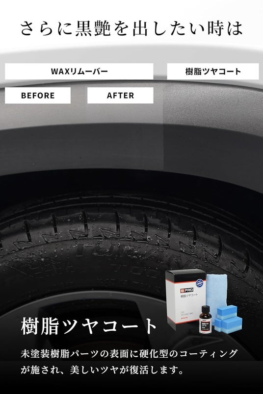 ・黒さとツヤが長期間キープ: 色褪せたバンパーやミラー部などもツヤっと美しく再生し、黒さの復活と新品同様のツヤが長期持続します。