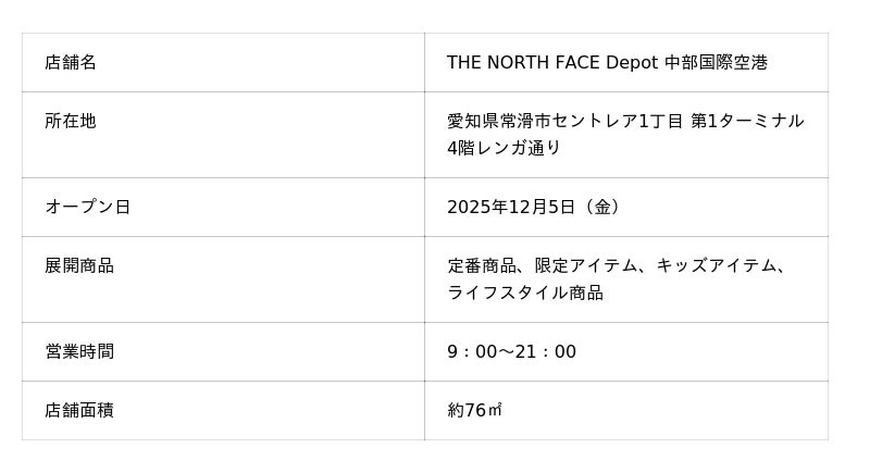 株式会社ゴールドウインは、2025年12月5日(金)、中部国際空港に、直営常設店舗「THE NORTH FACE Depot 中部国際空港」を新規オープンします!