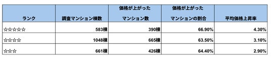 一方で、評価が星4つ、3つと下がるにつれて、価格上昇数の割合も上昇率も低下しています。