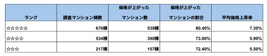 2006年以降築マンションでは評価が最も高い「星5つ」のマンション670棟のうち、約8割にあたる539棟で、平均7.3%の価格上昇が見られました。