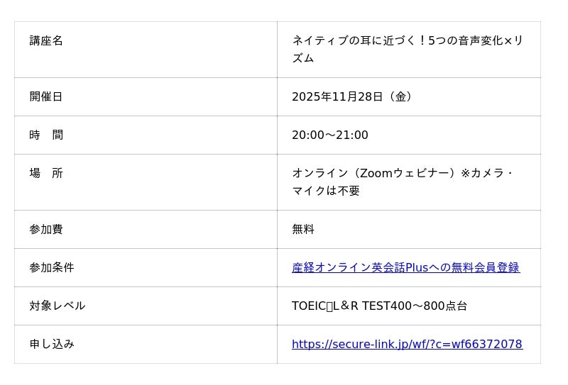 ●英語リスニング講座「ネイティブの耳に近づく!5つの音声変化×リズム~効果的な学習法&実践トレーニング解説つき~」を2025年11月28日(金)20時00分~21時00分にオンラインで無料開催