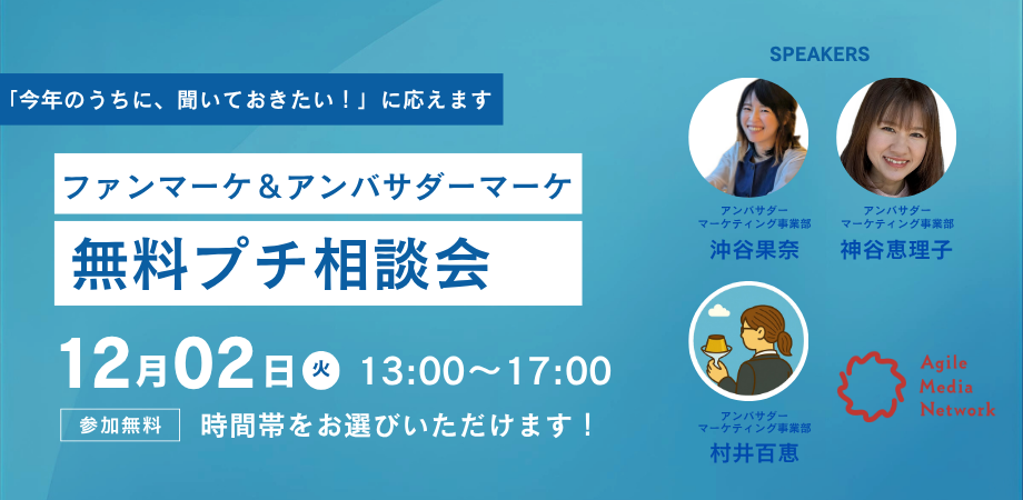 『世界中の“好き”を加速する』をビジョンに掲げ、ブランドのファン育成・活性化を手がけるアジャイルメディア・ネットワーク株式会社(本社:東京都港区、代表取締役社長:藤原宏樹、東証グロース上場:証券コード6573、以下AMN)は、このたび『ファンマーケ&アンバサダーマーケ 無料プチ相談会』を開催いたします。