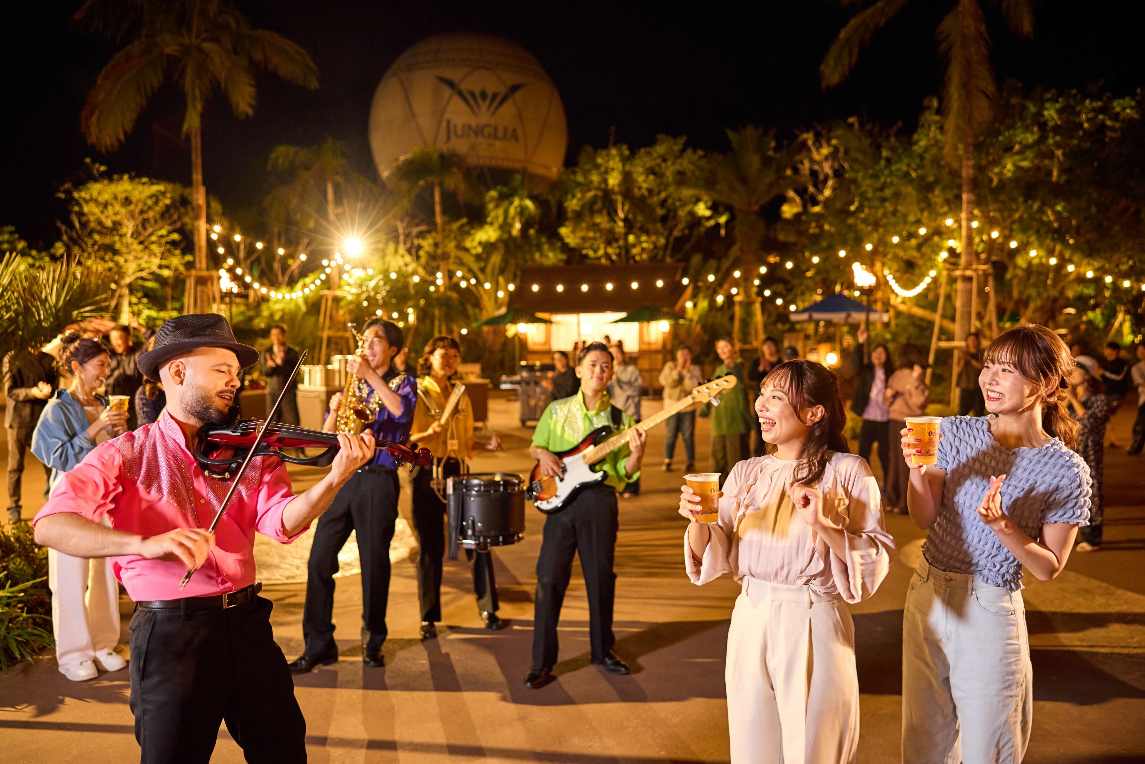 人気アトラクション「ダイナソー サファリ」では、デイタイムの体験では味わえない、闇夜ならではの恐竜との遭遇ができる特別演出が登場。ワイルド バンケットやインフィニティ テラスでは、オリオンビールを片手にミュージックライブや移り変わる美しい景色とともにお食事を楽しむ体験が加わり、夕暮れから夜にかけてのゆったりとした贅沢な時間を盛り上げます。もちろん、開業以来好評をいただいている「パノラマ ダイニング」での贅沢なディナーコース体験や、夕陽や夜の空気に包まれながら極上の時間を過ごす「スパ ジャングリア」、夜空を彩る花火ショーなど夕方~夜にかけての贅沢体験は、引き続き沖縄の旅を豊かに締めくくります。