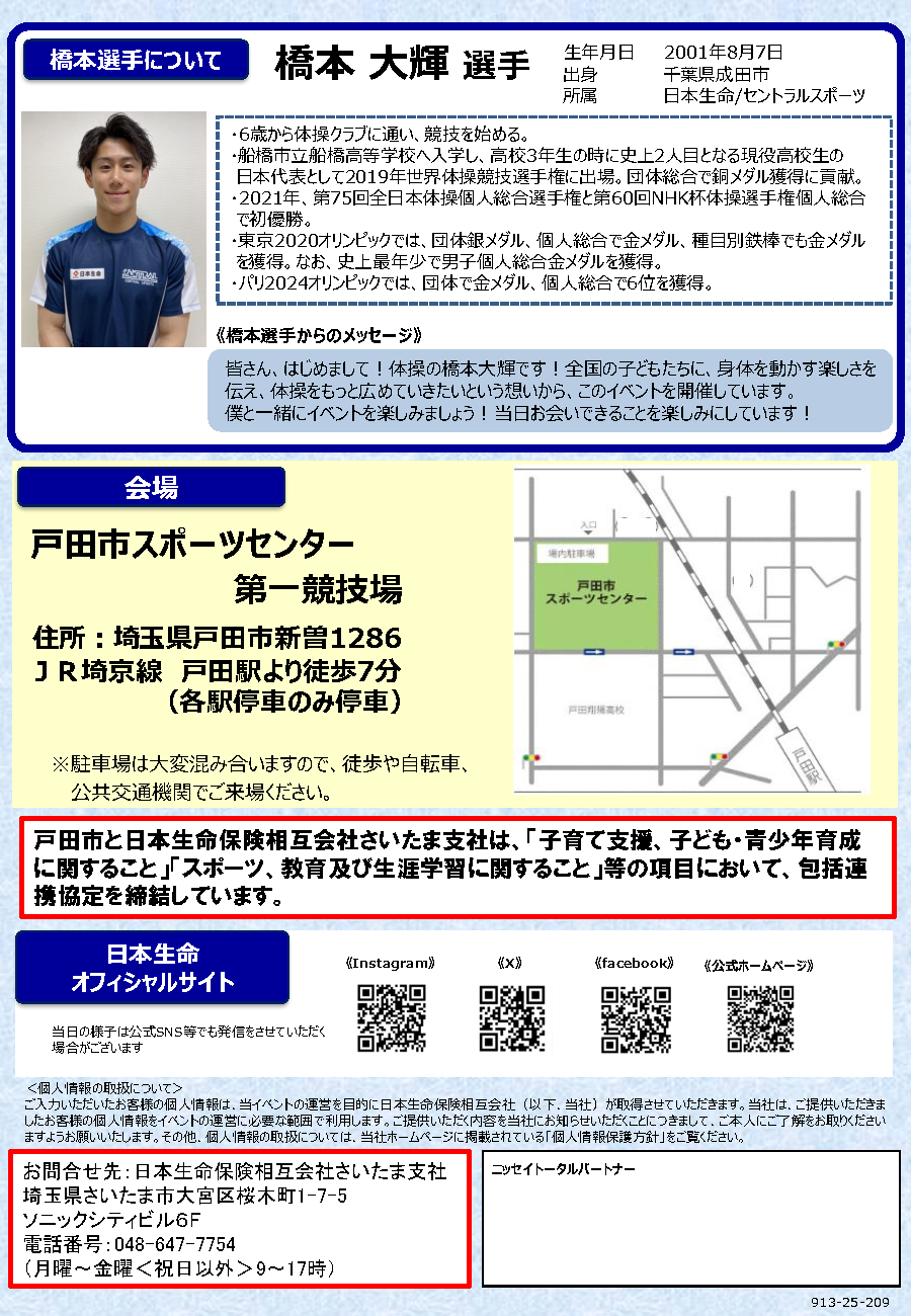 埼玉県戸田市では、男子体操競技 オリンピック2大会連続金メダリストで、10月に行われた世界体操 男子個人総合で3連覇の快挙を達成した、橋本 大輝選手による「体操教室&トークショー」を開催します。