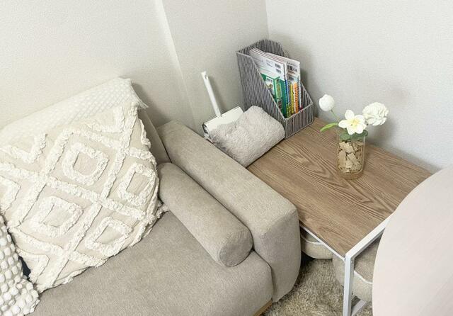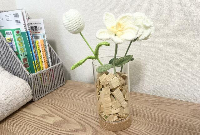 リビングは、300円アイテムが中心に展開される「THREEPPY」で、「ニットフラワー」を買い、こちらもトイレに置いたグリーンのようにヒバチップを敷き詰めています。