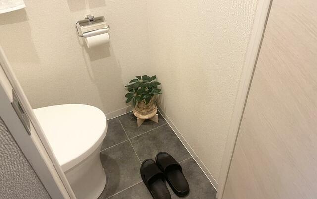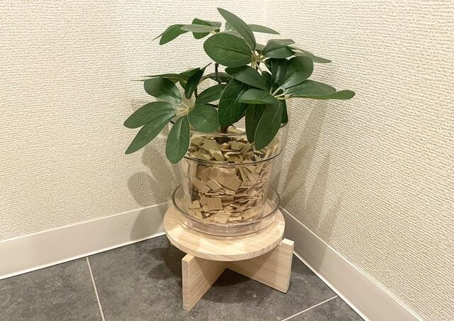 たとえば、トイレは「Standard Products」でフェイクグリーンとクリアの植木鉢、木製の台を購入し、植木鉢の中にヒバチップを敷き詰めています。
