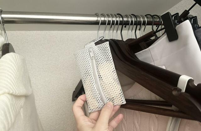 私は100均のファスナー付きメッシュポーチに入れて、空きハンガーにかけています。