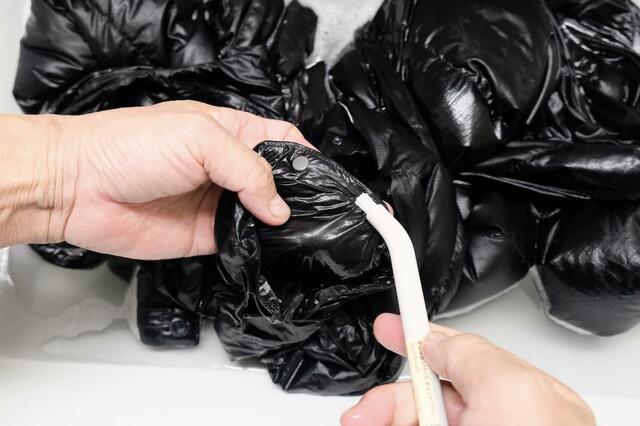 それでは早速、洗面台にぬるま湯を貯めて、適量の洗剤を混ぜ、ダウンコートを漬けます。