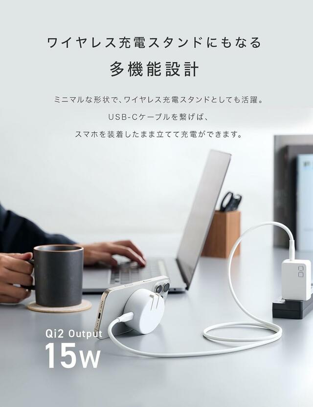 さらに、コンパクトに設計されていることから、吸着したままデバイスを立てることでスマホスタンド、ワイヤレス充電スタンドとして使うこともできるんです。
